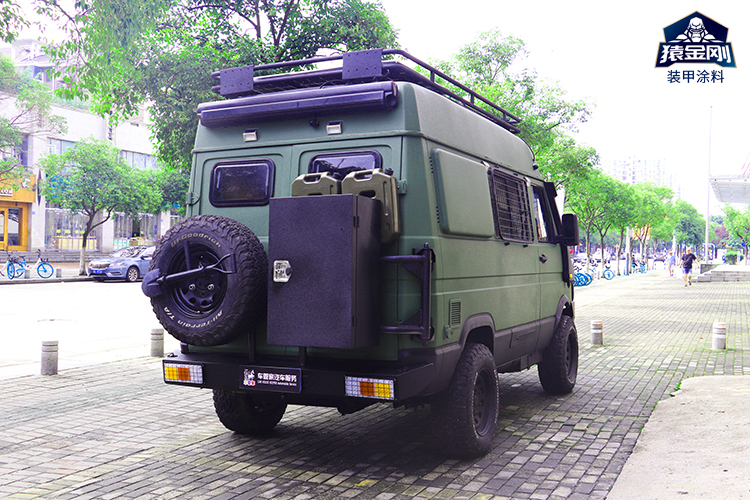 依维柯房车改装,定制喷涂猿金刚军绿色车身防爆装甲涂层尾部效果